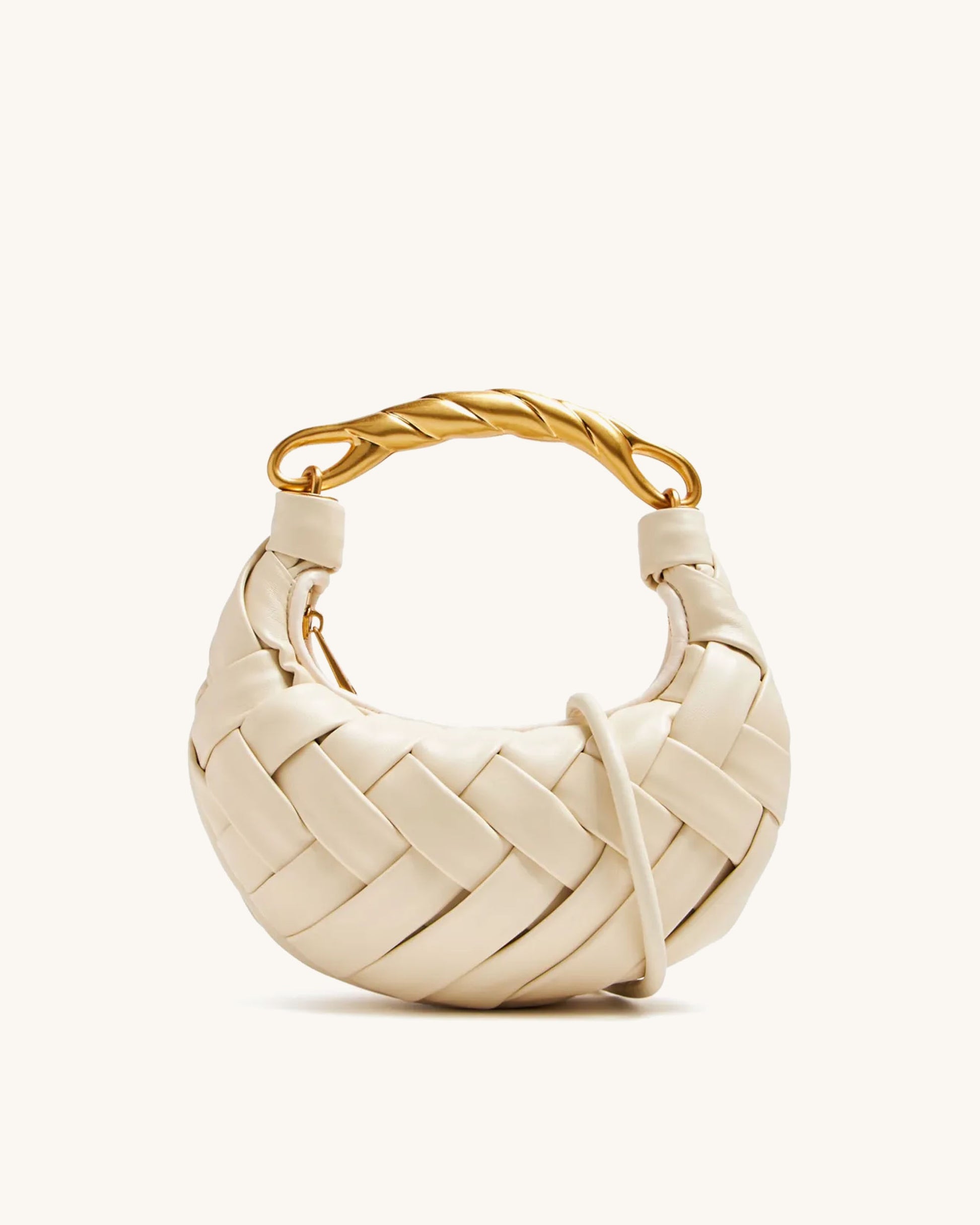 Handcrafted from premium leather in a bold woven pattern, this crescent-shaped mini bag features a statement gold-link handle that doubles as jewellery for your outfit. Its compact yet functional size is perfect for carrying essentials, making it your go-to for both brunch dates and evening soirées, the ultimate statement piece for the modern minimalist.