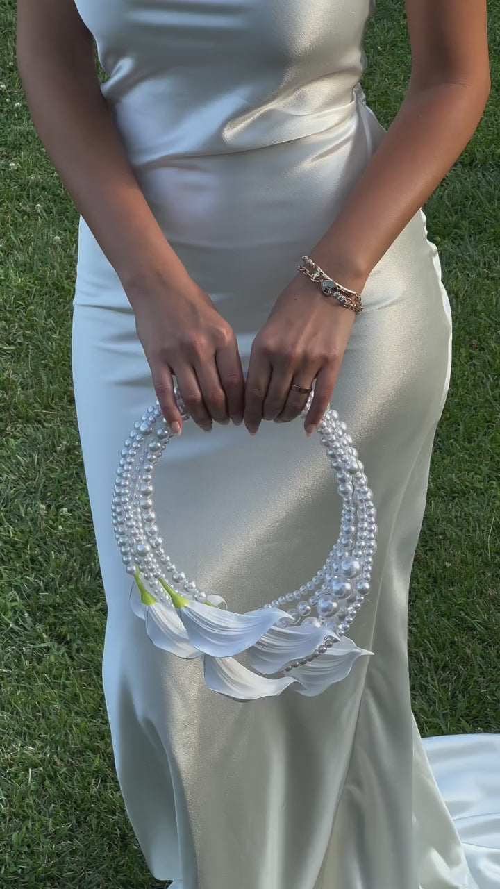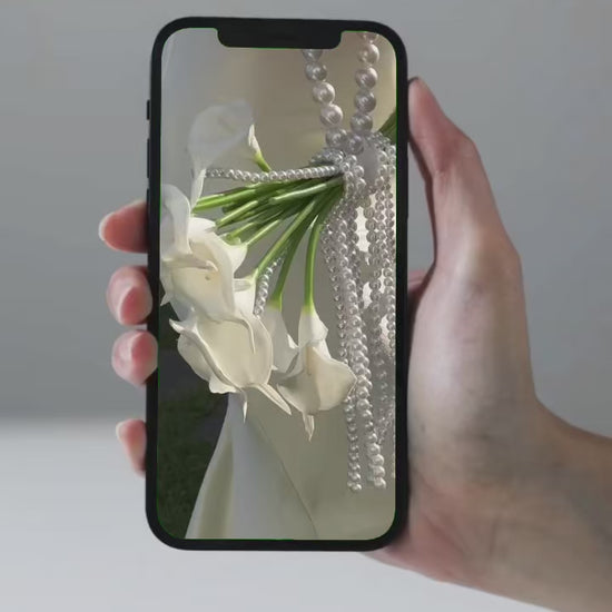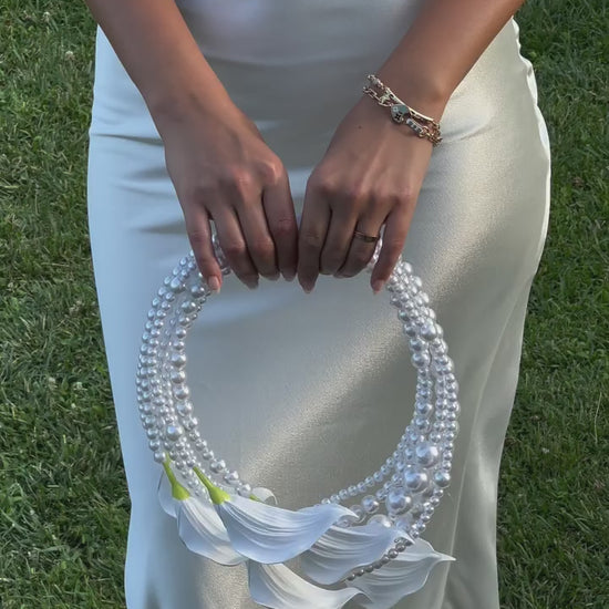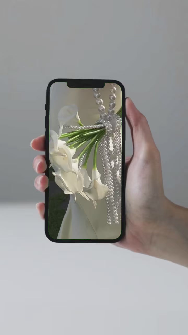 Redefining the bridal bouquet. The IIMANI Pearl Bouquet Bag transforms the tradition of florals into an heirloom accessory — a sculptural mix of elegance and emotion. Hand-strung with lustrous pearls and adorned with real-touch calla lilies, it’s designed to be carried like a bag, not a bouquet. Perfect for brides, bridesmaids, and modern romantics who crave something timeless yet new.